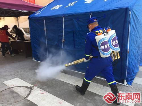 蓝天救援队员翁时国在城区来龙路口卡点消杀 吴美珍 摄