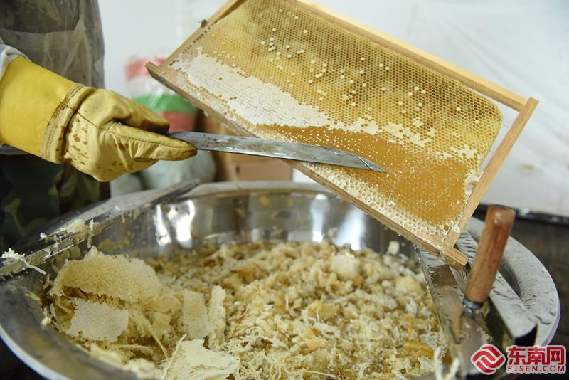 吴有通将蜂巢片的蜂蜜用刀切割下来,放入盆内在进行加工生产。黄杰敏 摄 社员吴应华在吴有通带动下,也开启了他的“甜蜜”事业。5年前,吴有通喊来朋友吴应华帮忙取蜜。对养蜂产生浓厚兴趣的吴应华决定跟着吴有通干,到今年,他养了100多箱蜜蜂,也成了村里的养蜂大户。“今年到现在,我们的蜂蜜产量已达到1万斤,接下来打算扩大生产规模,多养一些蜜蜂,拓宽销售渠道,进一步提升品牌知名度,争取入选武夷山水品牌。”吴有通对今后的发展很有信心。