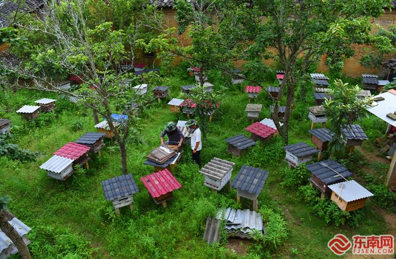 老房子前的蜂场伴随着几代人的记忆。黄杰敏 摄 想到父亲和爷爷有养蜂经验,2000年下半年,吴有通试着养了十几箱蜜蜂,“我第一年养蜂的收益就挺不错,而且养蜂投资少,又不占资源。” “回国后我就一直在家乡发展,家中几个兄弟姐妹都在省外工作,我在老家不但可以照顾妻儿,还可以赡养老人。”吴有通的父亲吴华满年过八旬,身体依然健朗,时常帮助儿子照看蜂场。“夏天马蜂很多,我们得把马蜂赶掉,不然马蜂多起来就会把蜜蜂挤走。”吴华满父子俩一边驱赶马蜂,一边检查蜂箱,为接下来蜜蜂的秋繁做准备。