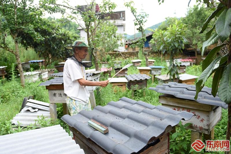 老人赶马蜂,夏天马蜂很多,马蜂多就会把蜜蜂赶跑,蜂蜜的产量就少了。黄杰敏 摄 20年来,吴有通不断钻研养蜂技术,从最初的十几箱,到现在的300多箱,随着养蜂规模的不断扩大,他成为政和县的养蜂大户之一。规模一扩大,吴有通想的就多了,先是在城关开了蜂蜜专卖店,然后又申报了“有通”商标。吴有通还免费向乡亲传授养蜂技术、赠送蜂箱蜂群,带动附近许多农户养蜂。2008年,吴有通牵头成立了有通蜂业专业合作社。合作社现有社员56人,年产蜂蜜上万公斤,产值100多万元。