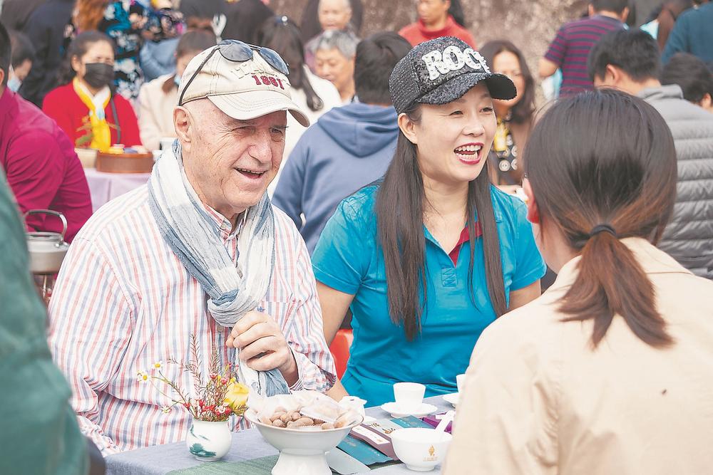 图为来自美国的国际友人在吃茶区了解武夷茶文化。(福建日报通讯员 伊凡)