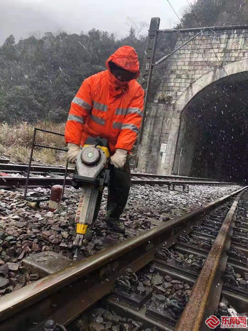 南平工务段光泽线路车间大禾山巡养站职工对鹰厦铁路进行成段更换钢轨。 何荣林/摄 1月7日8时,南平工务段光泽线路车间园岱巡养站巡查人员管道伯穿戴好雨帽、雨衣和防滑鞋,背上防护工具包,顶着强风大雪出门了,通过肉眼观测、手工检查等方式相结合对鹰厦线进行钢轨防断巡查,确认钢轨无损伤。 在鹰厦线大禾山至华桥区间,光泽线路车间大禾山巡养站十几名职工们利用175分钟的“天窗”时间,冒着大雪对钢轨进行成段更换。