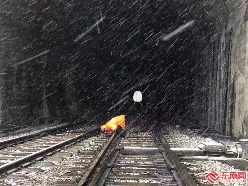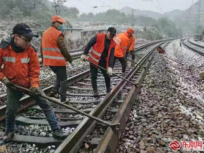 南平工务段武夷山线路车间黄莲坑巡养站职工正在对线路道岔进行养护维修作业。 赵阳/摄 受冷空气影响,昼夜温差大,是线路发生断轨的“高危时期”,南平工务段密切关注降雪天气预报信息,及时发布雪天预警信息,第一时间启动了管内钢轨防断人工巡查工作,安排人员逐段逐线路进行巡查;要求各车间对管内备用轨料、应急工机具、交通工具进行一次全面检查,提前发放草鞋、麻袋、草垫等防寒防雪物资;各线路车间重点针对可动心轨、合金钢组合辙叉、站场老杂轨、异型接头、绝缘接头、到发线无缝线路缓冲区等薄弱设备,伤损焊缝、黑斑轨等重点设备的检查,全力做好钢轨防断、扫雪除冰工作,确保铁路运输安全。