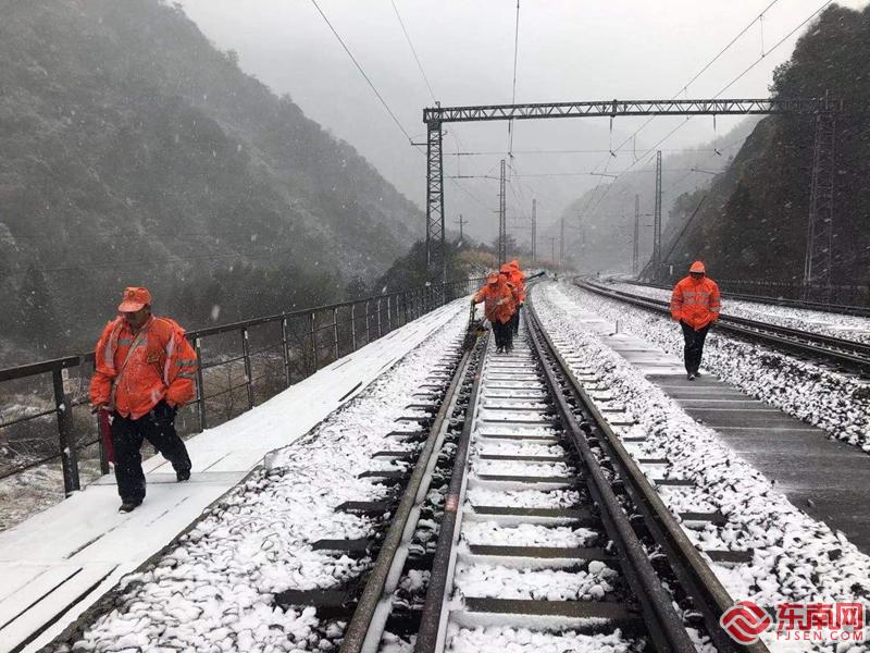 南平工务段武夷山线路车间黄莲坑巡养站职工中午下班途中。 赵阳/摄 工长陈志钢弯下身子,手撑着冰凉的钢轨上查看线路状态,还不时提醒大家:“雪下大了,大家要注意防滑!” 职工们撑着捣固机对线路道床进行捣固,不断调整线路数据情况,力求线路达到稳定状态。为了方便使用机具,职工们不得不脱下手套,双手被冻得通红,脸颊、睫毛都是雪化的水滴。 |