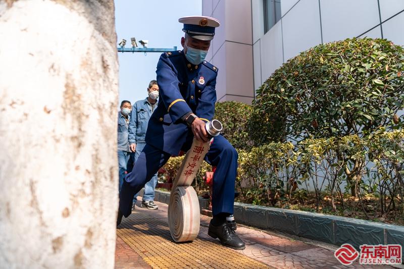 图为消防指战员向员工演示消防水带的使用方法。王浩焜 摄