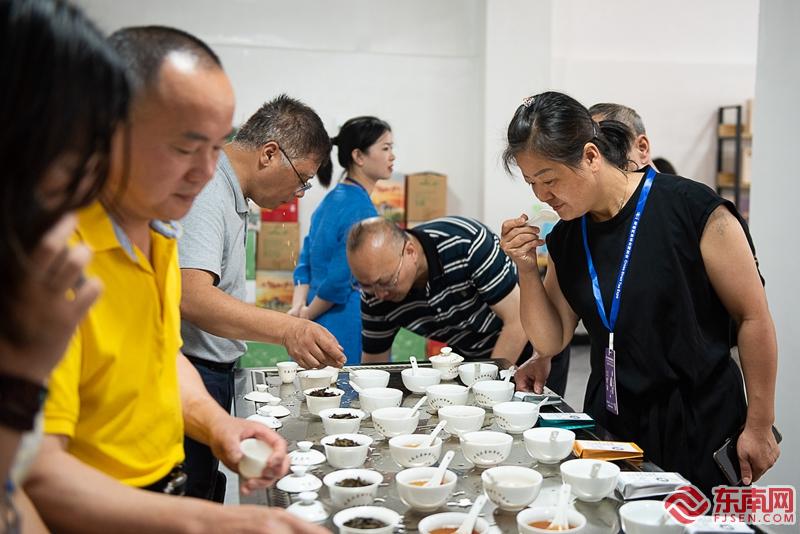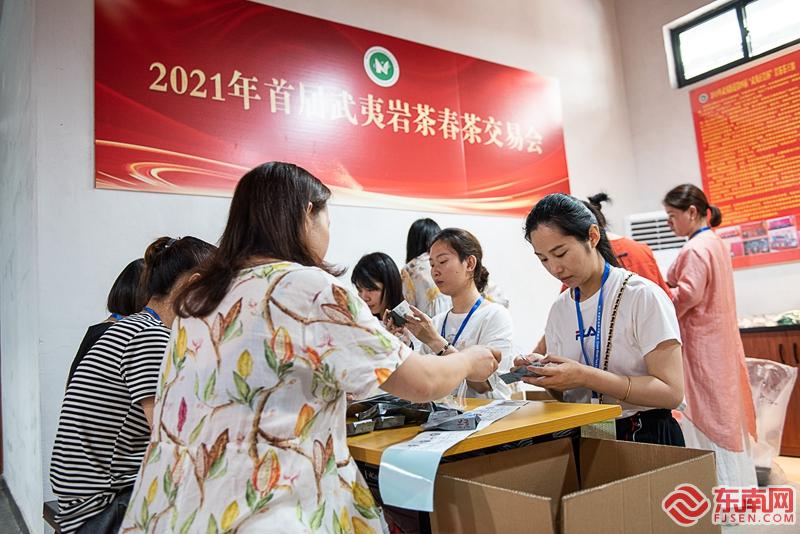 6月3日,在武夷山市武夷街道高苏板村,采购商正在品鉴、挑选武夷岩茶。伊凡 摄 东南网讯 连日来,由南平市海峡茶业交流协会青年联合会主办的2021年首届武夷岩茶春茶交易会,吸引了来自全国各地的茶商和本地的茶农、茶企进行茶叶交易及技艺切磋。