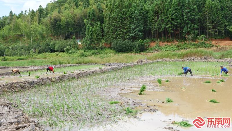 东南网讯 立秋将至,插秧农忙。8月5日,在建阳区童游街道彭墩村的农田里,农户们顶高温、冒酷暑,正在抢抓时节赶插优质晚稻。(
