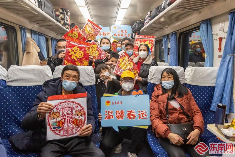 返乡的旅客高高兴兴回家 肖顺杰/摄 车厢内,休班的共青团员为旅客发放“福”字、铁路安全宣传单,讲解铁路路外安全知识,也把祝福送给回家的每一位旅客,祝福他们平平安安回家、高高兴兴过大年。 |