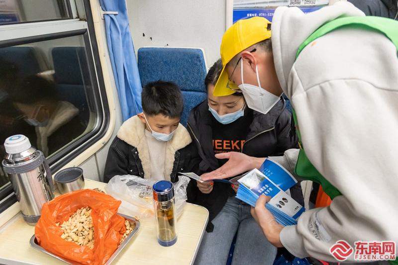 休班的团员青年化身志愿者,为车厢旅客发放铁路安全宣传手册。肖顺杰/摄 “各位旅客,我们是本次列车乘务员,同时也是南铁青年志愿者,您在旅途遇到任何困难都可以找我们,祝您旅途愉快。”团员青年们纷纷在车厢亮明身份,佩戴团徽和“共青团号”绶带,立足岗位展示团员先锋朝气蓬勃的精神力和战斗力。