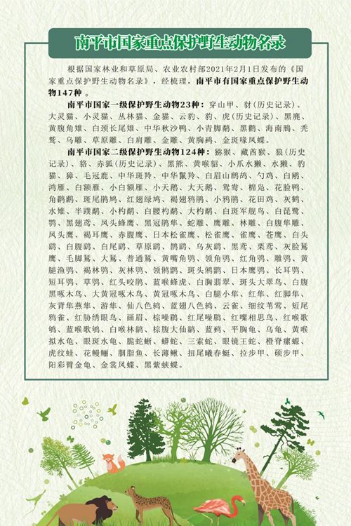 《南平市国家重点保护野生动物名录》收录了南平市国家重点保护野生动物147种,其中,国家一级保护野生动物23种,国家二级保护野生动物124种。