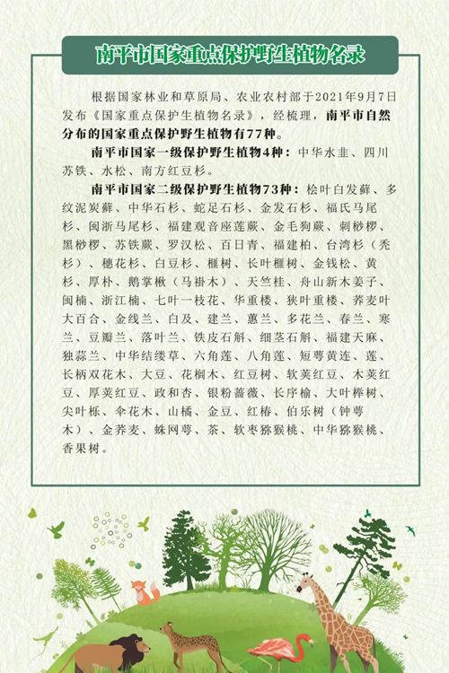 《南平市国家重点保护野生植物名录》收录了南平市国家重点保护野生植物77种及变种,其中,国家一级保护野生植物4种及变种,国家二级保护野生植物73种及变种。