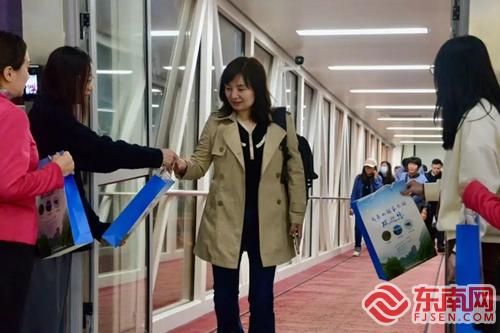 为武夷山机场落地乘客送上武夷岩茶、熏鹅等伴手礼。南平市交通运输局供图
