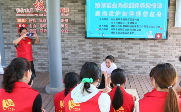 在花海公益书吧,“4+N”全民健康网格化服务团队代表向36家公益书吧代表捐赠防暑急救药箱,向5位公益书吧负责人颁发“全民健康宣传员”聘书。据了解,建阳区共组建“4+N”全民健康网格化服务团队112支,设置全民健康服务网格员309名,深入社区(村)、机关单位、企业、学校等健康网格,宣传政策、应急救护、职业健康、青春健康、健康素养等科普知识,营造健康宣传氛围,提高全民健康意识。