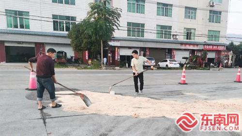 东南网10月15日讯(通讯员 图/文 陈蓉)近日,浦城临江镇政府接到群众报告,临江高速连接线与国道205线交界路段散落大面积柴油,路面遇到柴油后秒变“滑冰场”,沿途经过的机动车驶过油污路面产生打滑,存在较大的安全隐患。