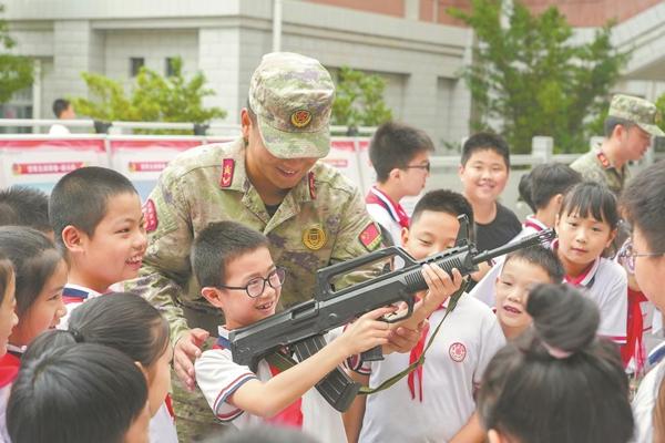 建阳区人民武装部基干民兵正在带领孩子们体验枪械模型。