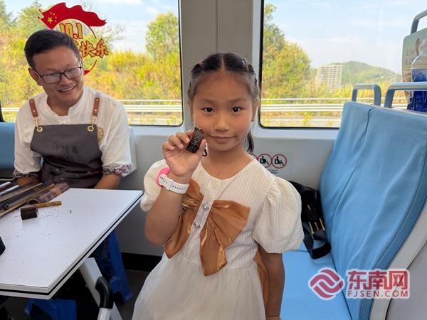 小乘客展示自己完成的武夷竹刻作品 图源:武夷有轨电车