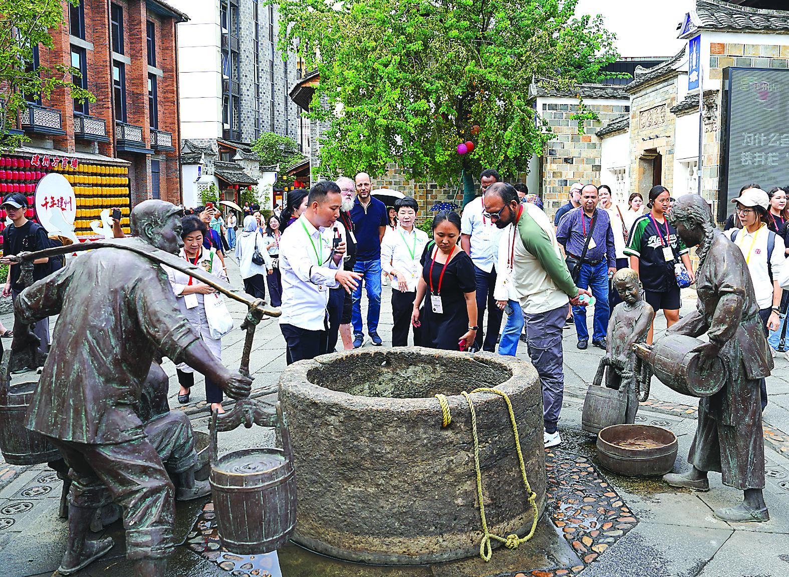 在建瓯市铁井栏—紫芝街历史文化街区,古建筑里装满了名士故事,令专家学者们沉浸其中——雀替咖啡馆里,花纹精美的雀替与智能机器人咖啡师冲泡的醇香咖啡引起阵阵赞叹;尚书井广场上,专家学者们仔细端详水井周边的图样,了解设计中蕴含的“福禄寿喜”寓意和实用价值;殷闽文化馆内,一件件藏品安静地述说着“千年建州”的文脉赓续……