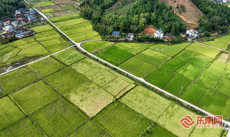 金秋十月,武夷山市岚谷乡横墩村、岚谷村千亩高标准农田稻浪滚滚,色彩斑斓、稻穗随风摇曳,一派丰收景象;近年来,武夷山市积极推进高标准农田建设,把山水田林路融为一体,今年又是一个丰收年。(邱汝泉/摄)
