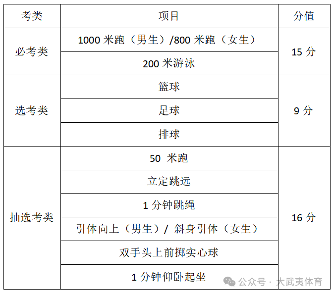 分值分配优化→调整后40分的分值分配明确为三类。一是必考类15分,保留1000米跑(男生)/800米跑(女生)、200米游泳两个项目;二是选考类9分,对应“三大球”选考项目;三是抽选考类16分,涵盖50米跑、立定跳远、1分钟跳绳、引体向上(男生)/ 斜身引体(女生)、双手头上前掷实心球、1分钟仰卧起坐六个项目。