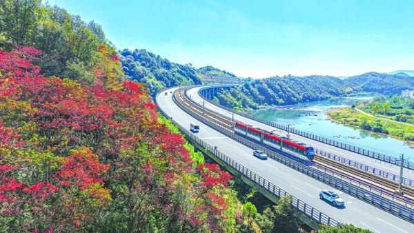 19日,汽车与轻轨列车行驶在省道303线建阳至武夷山段。该路段风光秀丽,“车在景中行,人在画中游”的诗意美景引人入胜。 (朱宇 摄)