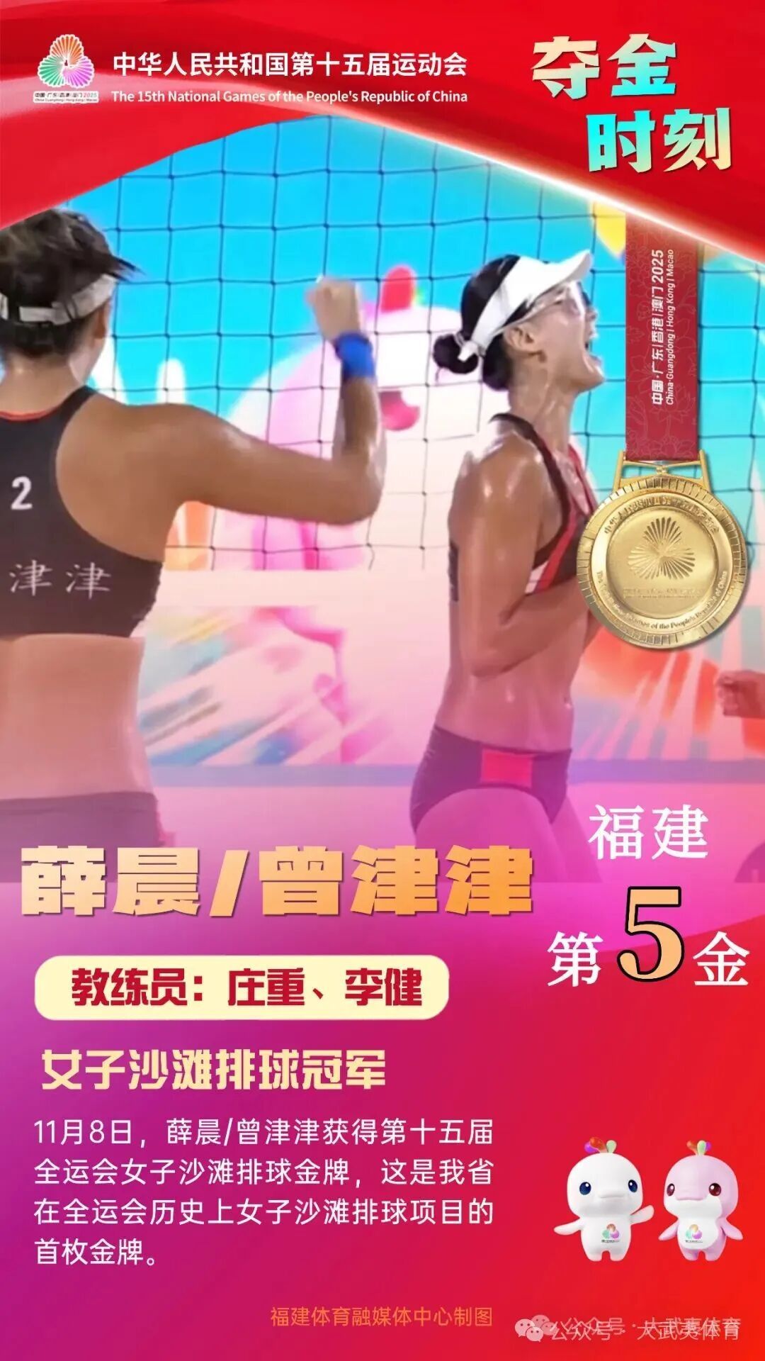 11月8日,我市选手曾津津与队友薛晨斩获女子沙滩排球金牌,这是我省在全运会上女子沙滩排球项目的首枚金牌!