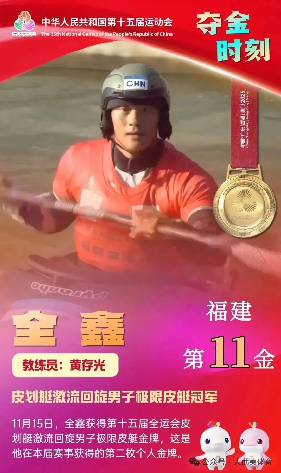 11月13日,在第十五届全运会皮划艇激流回旋男子单人皮艇比赛中,全鑫获得金牌,实现该项目全运会三连冠。11月15日,全鑫又获得第十五届全运会皮划艇激流回旋男子极限皮艇金牌,这是他在本届赛事获得的第二枚个人金牌。