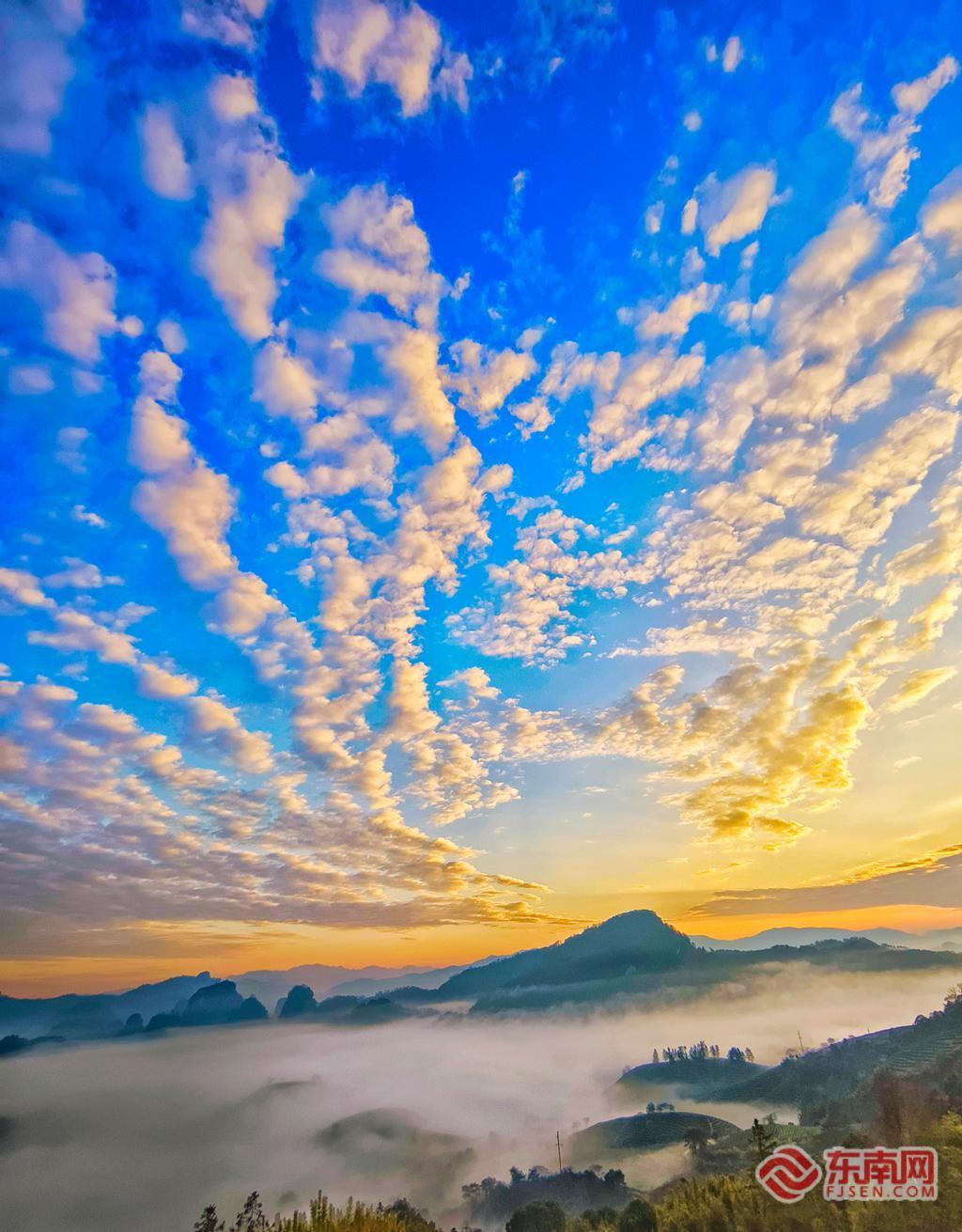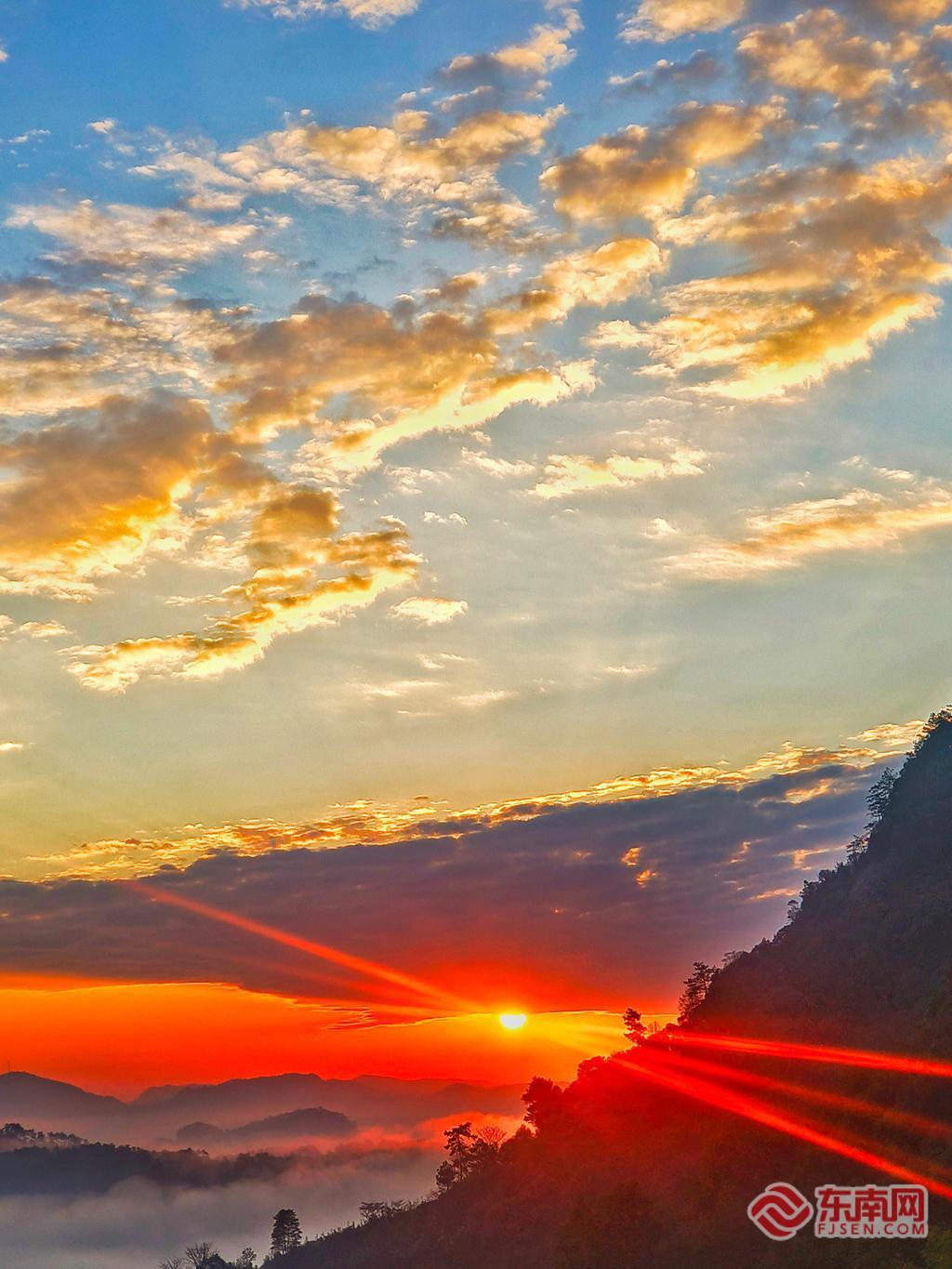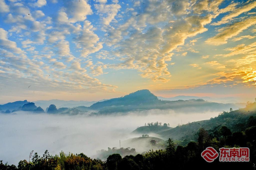 东南网12月7日讯(通讯员 邱汝泉)12月17日,天刚破晓,武夷山国家公园的群山还浸在浅淡的晨雾里,一缕缕朝霞率先撕破天际,将金红的柔光泼洒在连绵起伏的峻岭之上。云海像是被打翻的棉絮,在山谷间缓缓涌动,时而漫过青黛色的峰尖,时而露出嶙峋的岩骨,峰峦在云雾里时隐时现,宛如仙境里的蓬莱。朝霞的暖色晕染在云海上,让那片白茫茫的云海镀上了一层鎏金,与红绿相间的林木、褐红的丹霞岩壁相映成趣,山风掠过,云海翻涌,霞光流转,整座山林都浸在这幅流动的、壮丽无比的画卷里。