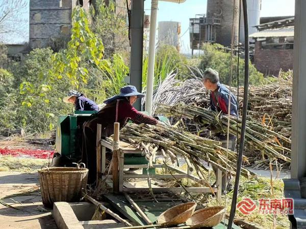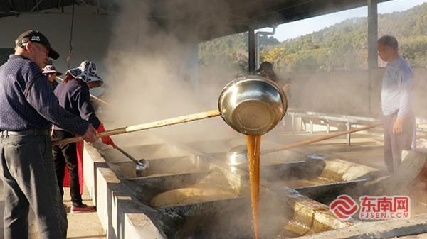 伴随着榨汁机的轰鸣,一根根甘蔗被送入机器,清甜的蔗汁汩汩流出,待蔗汁沉淀澄清,便被缓缓倒入炼糖锅中。熬糖师傅们分工明确,手持长勺一遍遍撇去浮沫、不停搅拌。黏稠的蔗汁在空中拉出晶莹的糖丝,划出一道优美的弧线。
