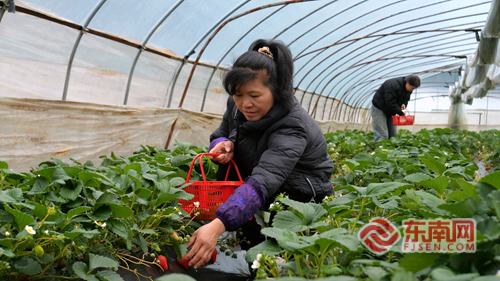 近日,在麻沙镇扁溪村阿兰牛奶草莓采摘园的大棚里,种植户陈玉兰正忙着采摘成熟的草莓,丰收的喜悦溢于言表。