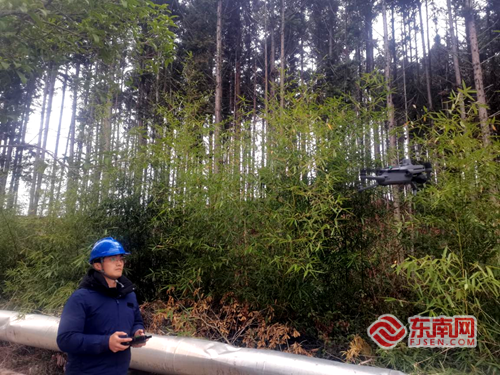 国网光泽县供电公司工作人员利用无人机对10千伏崇仁线开展精细化巡检