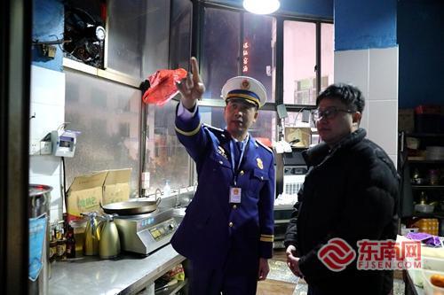 消防检查人员向场所负责人叮嘱厨房用火用电注意事项。郑振盛 摄
