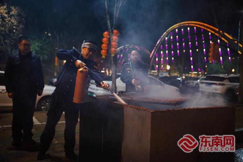 巡查队扫视着沿途的燃放情况,行至某小区门口的集中燃放点,现场烟雾弥漫,一股浓烈的硫磺味扑面而来。建瓯生态环境局大气科对接人陈键清停快步上前,提醒正在值班的保安:“辛苦了,除夕烟花爆竹燃放的人多。你们一定要多巡查,发现未燃放干净的残屑要及时清理、浇水,谨防火灾发生和空气污染。”
