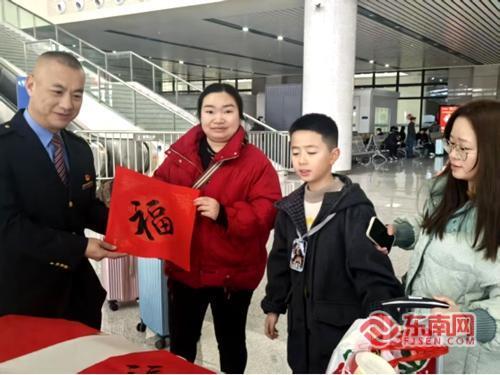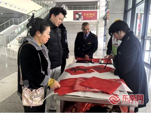 东南网2月25日讯(通讯员 图/文 李繁亮)春节期间,中国铁路南昌局集团公司南平车务段延平西站候车室内墨香四溢、暖意融融。延平西党总支组织车站职工写“福”字、送祝福,开展“新春延福”惠民志愿服务活动,为南来北往的旅客送上新春的温暖和美好的祝愿,以实际行动践行“人民铁路为人民”的服务宗旨。