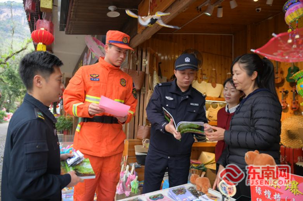 上午10时,来自福建省公安厅森林公安局武夷山国家公园分局、武夷山消防救援机动大队、武夷山国家公园福建科研监测中心及武夷山国家公园福建武夷保护站等单位的20余名工作人员,组成两支宣传小分队,循着武夷山的山水脉络开展工作:一队驻守武夷宫,面向往来游客与周边商户传递法治理念;另一队沿九曲溪岸深入玉女峰腹地,走进山间村落与徒步线路,将保护知识送到村民、游客手中。
