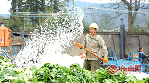 眼下正值糟菜原料收购旺季,3月5号,在建阳区水吉兄弟食品有限公司,新鲜采收的芥菜、萝卜源源不断运到生产基地内,员工们将原料有序倒入腌制池。