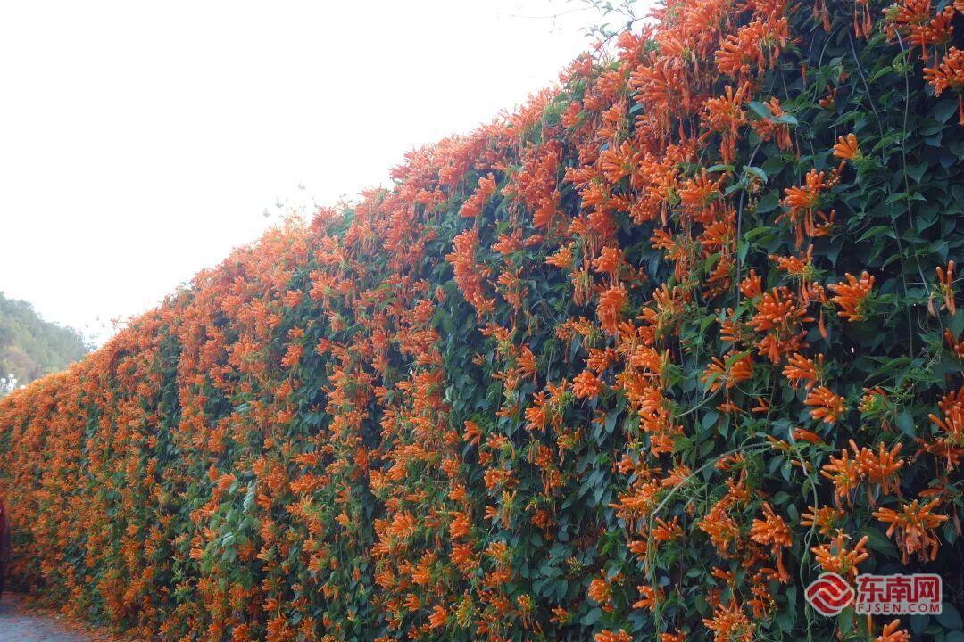 而在江滨中路的古渡码头旁,橙红色的炮仗花正如瀑布般倾泻而下,与江水、古渡相映成趣。市民陈先生周末特地驱车前来赏花,在花树下久久驻足:“这花开得实在太漂亮了,感觉工作了一周的疲惫,看着这些花就全消了。”
