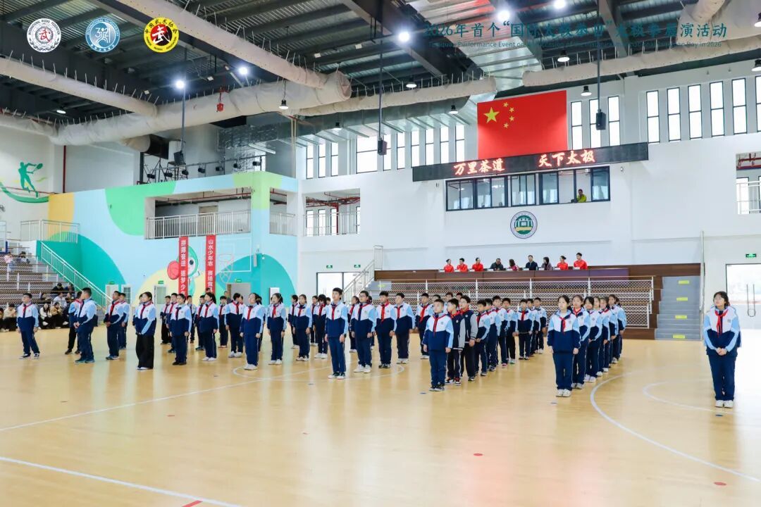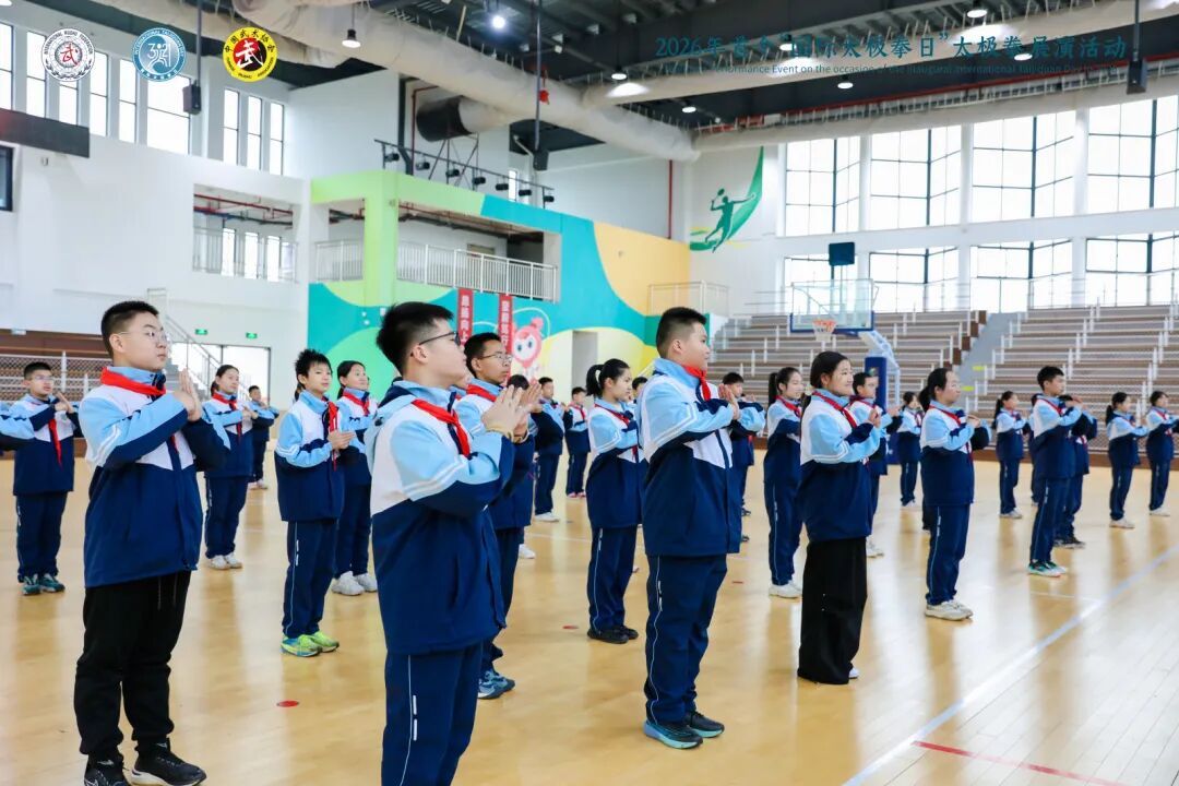 在世界冠军的带领下,学子们共同演练二十四式太极拳。他们列队整齐,动作虽显稚嫩却认真专注,一招一式行云流水、刚柔并济,展现出青少年昂扬向上的精神风貌。