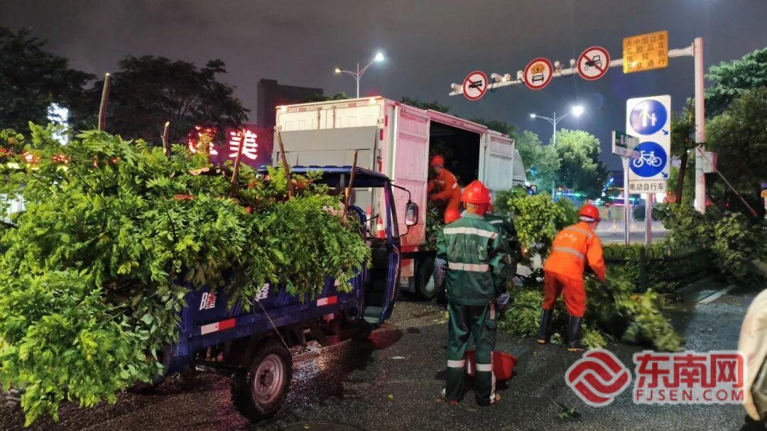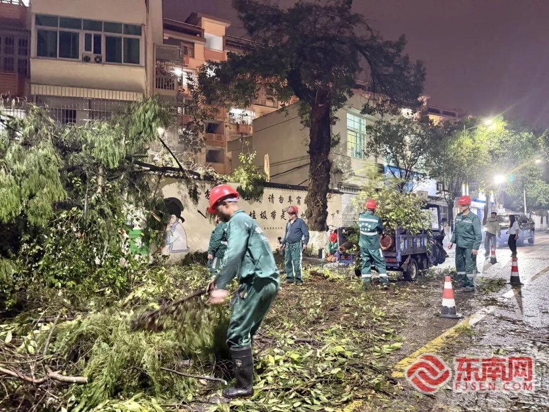 抢险人员沿路排查路面、绿地内的倒伏、折断树木,有序开展切割、清运、清理作业,全力疏通受阻道路。截至当晚21时,对宝山路、考亭桥下、朱熹大道、建平大道与熹建路路口等易积水点位开展应急抢险,出动30人次、10车次。消除积水点20余处,同时,对童新小区、领世郡、劝业路、曼头山路四条下穿通道等常积水点位,进行24小时值守巡查。出动一线保洁员300余人、高压水车5辆、大件垃圾收运车2辆、小型垃圾收运车及快速保洁车52辆,开展道路保洁作业,并积极配合清理路面倒伏及折断树木。现场应急处理垃圾分类亭倒伏4处,果皮箱倒伏9处,垃圾桶倒伏57处;累计清理市政道路人行道及路沿树枝落叶约3吨,并根据以往经验对易积水点位全面排查,清理被树枝、树叶堵塞雨水箅600余处,有效缓解城市道路积水问题;同时积极组织对垃圾中转站进行应急吸污作业,有效避免渗滤液外溢。