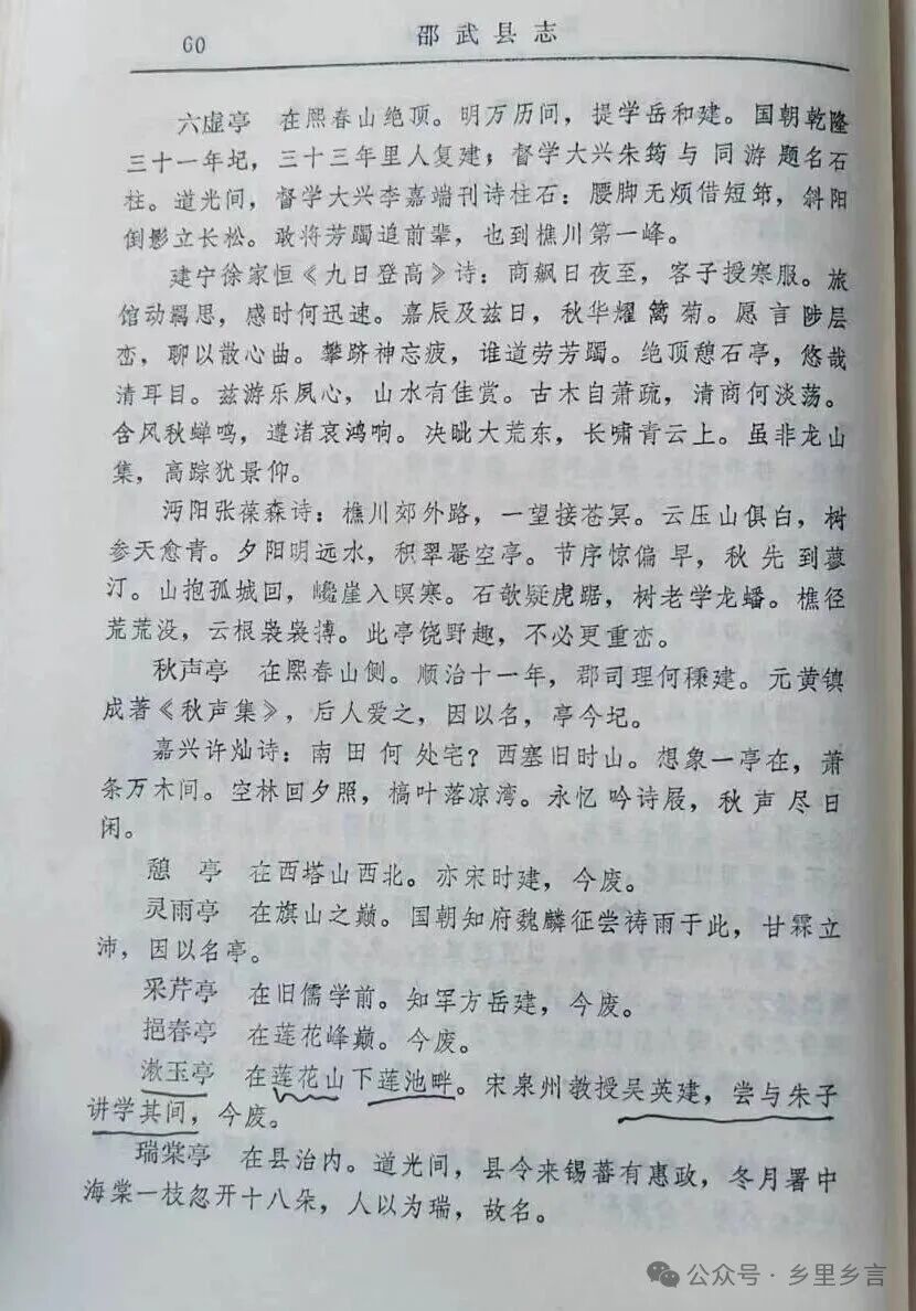 (清)咸丰《邵武县志》载莲花山、莲花峰,均与吴英有关,前居城南建漱玉亭,后处城北系葬之地。漱玉亭在城南的“莲花山下莲池畔”,很容易与城北的吴英所葬之地“莲花峰”当“莲花山”混淆!