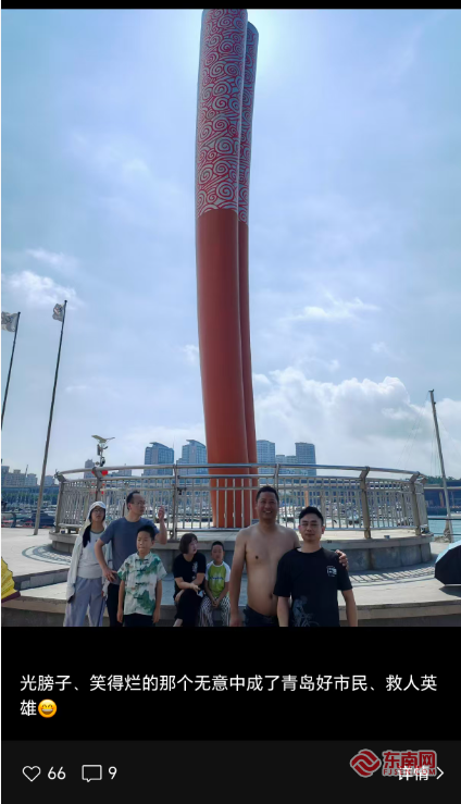 救援结束,阳光渐暖。吴平全身湿透,“大清早衣服没地方买,我们又是临时待一天,没有可以换的。”他笑着告诉记者,他干脆光着膀子在太阳下晾晒。救人之举使三人心情分外舒畅,他们与同行的亲友在五四广场的奥运火炬下合影。刘宗明在朋友圈写道:“光膀子、笑得灿烂的那个无意中成了救人英雄。”他们把这场义举当作旅行中的一段小插曲。