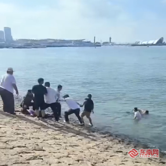 刘宗明眼见妹夫再次跳入海中,强压心中担忧,继续组织岸上人员接应。保安身材高大,现有人力不足,他立即朝围观人群高喊:“大家下来搭把手!”话音未落,又有数名市民主动上前,手挽手、脚抵脚,在湿滑的礁石上连成一条坚实的“生命之链”,合力将保安安全拉上岸。一场与海浪赛跑的生死救援顺利完成。