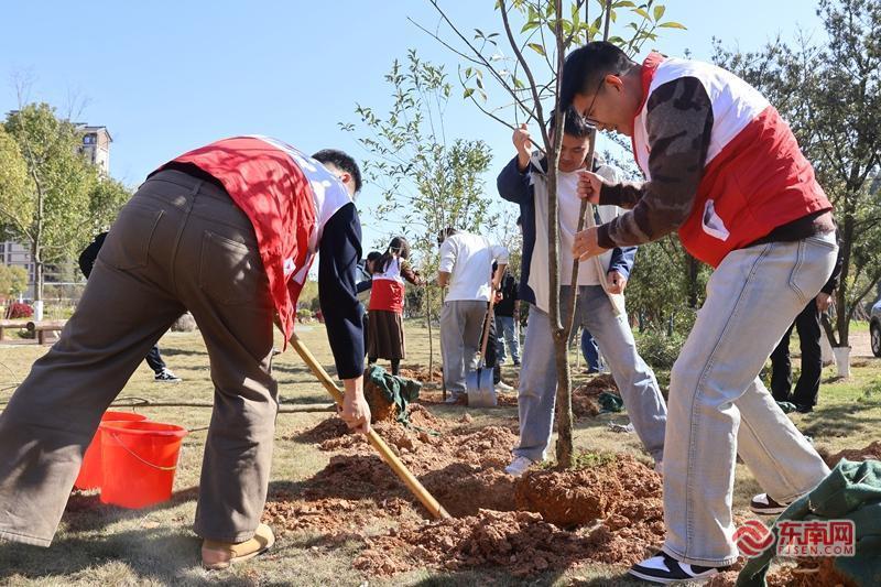 在建阳区花海公园,养护工人早已提前勘测点位、挖好树穴,不多时,44名志愿者汇聚于此,种上一棵桂树,为城市增添一抹新绿。